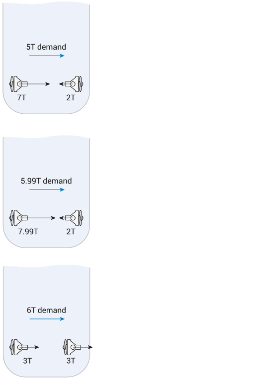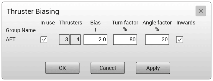 El factor de Giro determina cuando girar un propulsor dentro de un grupo, en lugar de continuar contrarrestando al otro propulsor. La fuerza máxima para cada propulsor es de 10 tonos y la fuerza de ralentí o de polarización es de 2 tonos.